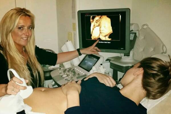 Ultrasound, also known as sonography, is a technique that uses sound waves. Sound waves are sent into the uterus via a probe; these sound waves reflect off structures/tissues in the abdomen, creating an image. The sound waves are inaudible and harmless during pregnancy.